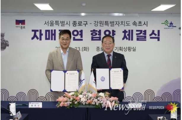 뉴스펀치 김완규 기자 | 종로구는 9월 23일 구청 기획상황실에서 속초시와 자매결연을 맺었다. 이로써 두 도시는 교육·문화·관광을 비롯해 재난 대응까지 다양한 분야에서 교류와 협력을 강화할 방침이다.