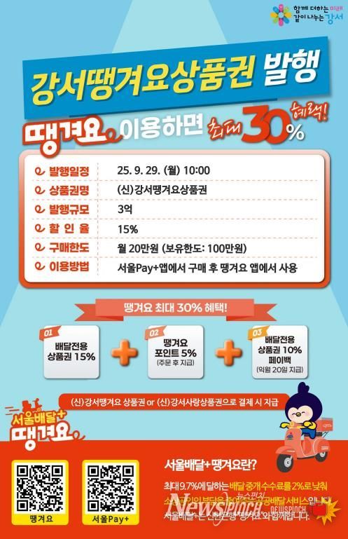 서울 강서구는 오는 29일 공공배달앱 ‘땡겨요’에서 사용가능한 상품권 총 3억 원을 발행한다.