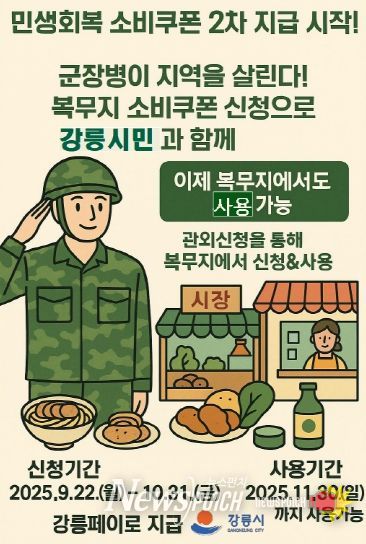 뉴스펀치 김길룡 기자 | 강릉시는 민생회복 소비쿠폰 2차 개선 사항인 군 장병 복무지 신청을 위하여, 9월 24일부터 관내 부대를 대상으로 '민생회복 소비쿠폰 군 장병 대상 찾아가는 신청 서비스'를 운영한다.