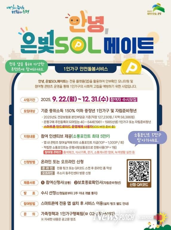 뉴스펀치 김완규 기자 | 서울 은평구는 지난 22일부터 1인 가구 안전돌봄서비스 ‘안녕, 은빛SOL메이트’ 참여자 모집을 시작했다고 밝혔다.