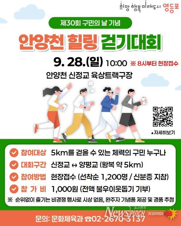 뉴스펀치 김완규 기자 | 영등포구가 제30회 구민의 날을 기념해 오는 9월 28일 안양천 신정교 육상트랙구장에서 ‘안양천 힐링 걷기대회’를 개최한다고 밝혔다. 대회는 영등포구 육상연맹에서 주관하고 영등포구와 영등포구 체육회에서 후원한다.