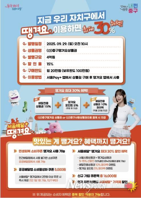 뉴스펀치 김완규 기자 | 서울 중구가 오는 29일 오전 10시, 총 4억원 규모의 ‘(신)중구땡겨요상품권’을 발행한다.