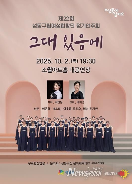 뉴스펀치 김완규 기자 | 서울 성동구는 오는 10월 2일 저녁 7시 30분 소월아트홀에서 성동구립 여성합창단 '제22회 정기 공연'을 개최한다고 밝혔다. 공연 부제는 '그대 있음에'로 가을밤, 구민들에게 사랑과 위로의 하모니를 선사할 예정이다.