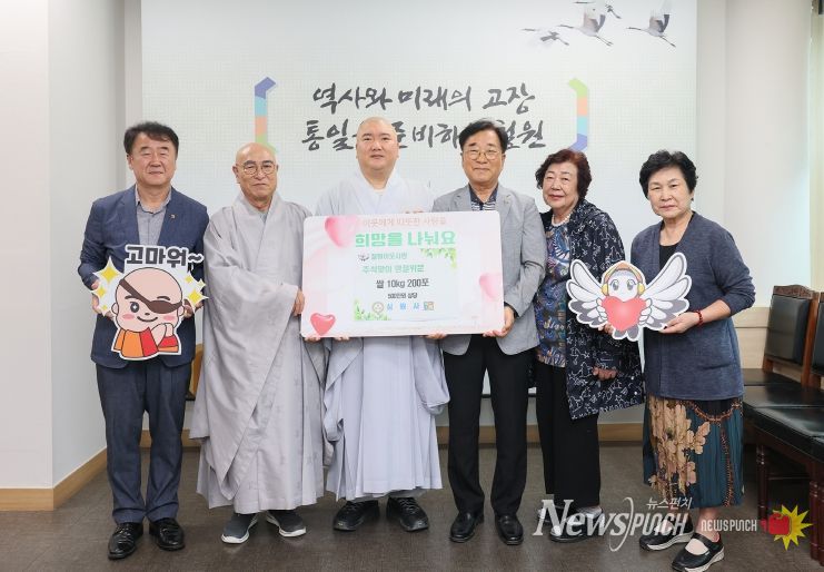 뉴스펀치 김길룡 기자 | 심원사에서 추석 명절을 맞아 지난 24일 철원군청을 방문하여 사랑의 이웃돕기 동참의 뜻을 밝히며 500만원 상당의 철원오대쌀(10kg) 200포를 기탁했다.
