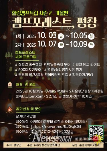 뉴스펀치 김길룡 기자 | 평창관광문화재단은 바위공원 힐링 프로그램 운영 사업을 통해 가을철 자연 속 힐링과 체험을 결합한 가족 단위 캠프 프로그램, '캠프포레스트, 평창'의 참가자를 모집한다. 행사는 오는 10월 3일부터 9일까지 평창군 평창읍 바위공원 일대에서 진행된다.