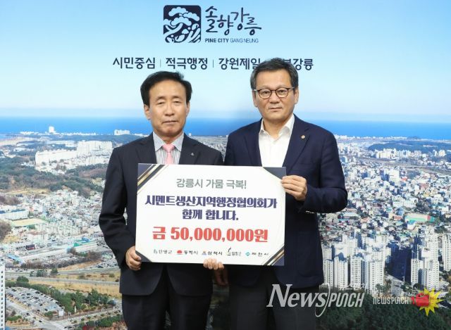 뉴스펀치 김길룡 기자 | 시멘트 생산지역 행정협의회(회장 단양군수)는 지난 25일 유례없는 가뭄을 겪었던 강릉시에 성금 5,000만 원을 기탁했다.