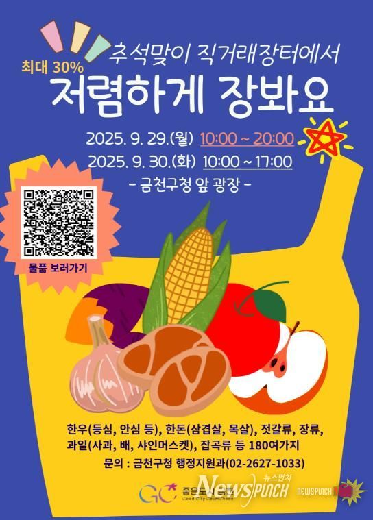 뉴스펀치 김완규 기자 | 금천구는 오는 29일과 30일 금천구청 광장에서 ‘2025년 추석맞이 농·축·수·특산물 직거래장터’를 연다고 밝혔다.
