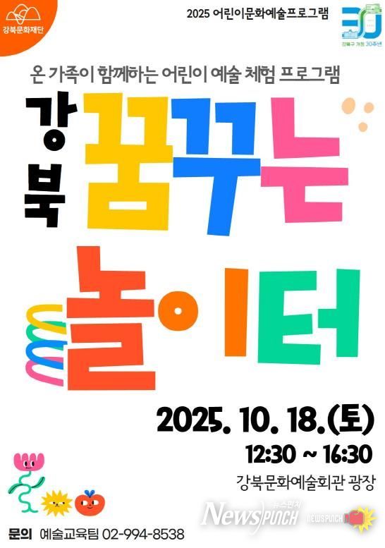 뉴스펀치 김완규 기자 | 서울 강북문화재단은 오는 10월 18일 강북문화예술회관 광장에서 문화의 날을 맞아 세대 간 소통과 가족 간 유대감을 다질 수 있는 체험형 축제 ‘강북 꿈꾸는 놀이터’를 개최한다.