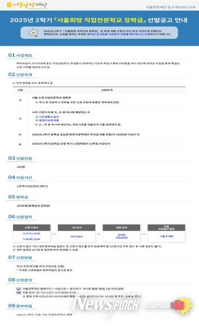 뉴스펀치 김완규 기자 | 서울장학재단은 경제적인 부담으로 학업을 이어가기 어려운 직업전문학교 재학생을 지원하기 위해 '서울희망 직업전문학교 장학금' 2025년 2학기 장학생을 모집한다. 모집 기간은 9월 17일 오전 10시부터 30일 오후 4시까지이며, 102명을 선발해 1인당 150만 원의 등록금을 지원한다.