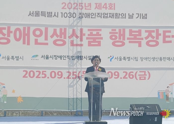 뉴스펀치 김완규 기자 | 서울특별시의회 보건복지위원회 김영옥 위원장(국민의힘, 광진3)은 9월 25일부터 26일까지 양일간 반포한강공원 달빛광장에서 개최되는 『2025년 제4회 장애인직업재활의 날 기념 행복장터』에 참석해 장애인과 비장애인이 함께하는 화합의 장을 축하했다.