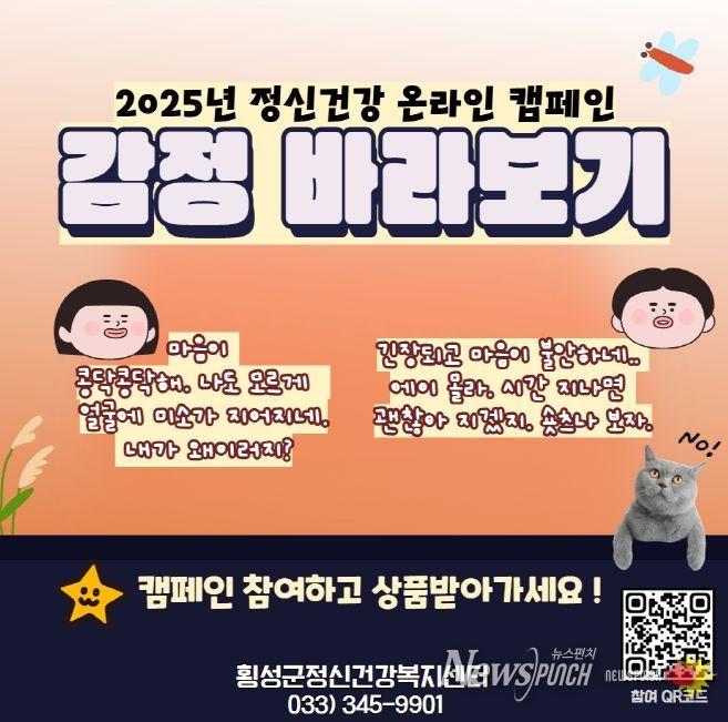 뉴스펀치 김길룡 기자 | 횡성군정신건강복지센터가 오는 10월 10일 ‘정신건강의 날’을 기념해 9월 29일부터 10월 17일까지 군민을 대상으로 정신건강 온라인 캠페인 '감정 바라보기'를 진행한다고 29일 밝혔다.
