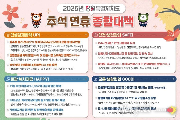 뉴스펀치 김길룡 기자 | 강원특별자치도가 10월 3일부터 9일까지 7일간 이어지는 추석 연휴 동안 도민과 귀성객이 안전하고 편안한 명절을 보낼 수 있도록 ‘추석 연휴 종합대책’을 추진한다고 29일 밝혔다.