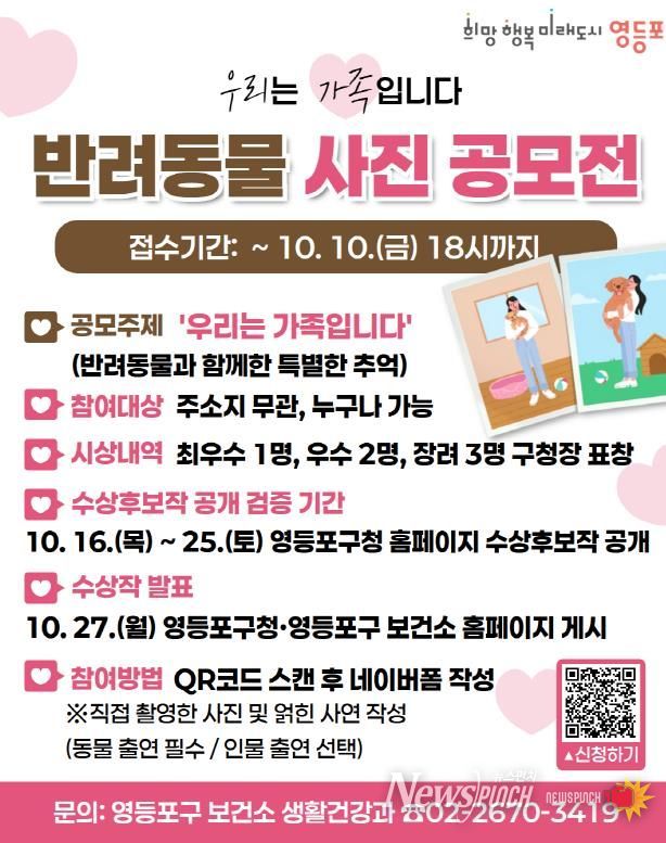 최호권 영등포구청장은 “반려동물은 이제 보호나 애완의 대상을 넘어 진정한 가족으로 자리 잡고 있다”라며 “이번 공모전이 반려인들이 서로의 추억을 나누고, 반려동물과 사람이 공존하는 건강한 문화를 확산하는 계기가 되기 바란다”라고 전했다.