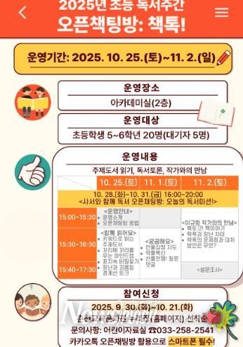 뉴스펀치 김길룡 기자 | 춘천교육문화관은 책 읽기 좋은 계절인 가을을 맞아 오는 10월 25일, 10월 28일부터 11월 2일까지 초등학생 5~6학년 학생 20명을 대상으로 초등 독서주간 ‘오픈책팅방 책톡!’을 운영한다.