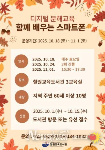 뉴스펀치 김길룡 기자 | 철원교육도서관은 지역 고령층의 디지털 활용 능력 향상과 격차 해소를 위해 오는 10월 18일부터 11월 1일까지 매주 토요일, 총 3회에 걸쳐 ‘함께 배우는 스마트폰’ 디지털 문해교육을 운영한다.