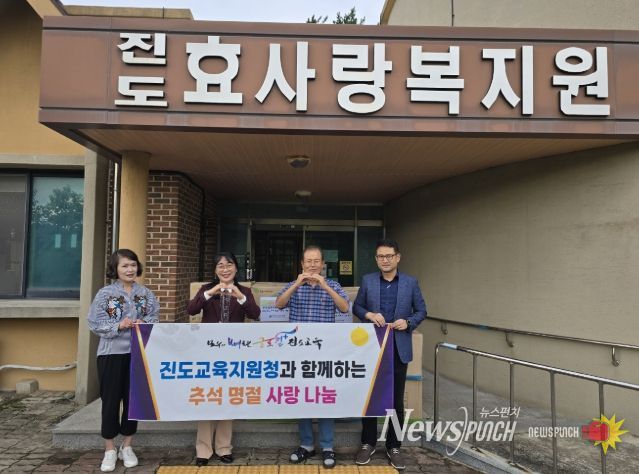 뉴스펀치 손석남 기자 | 진도교육지원청은 9월 29일 다가오는 추석 명절을 맞아 지역 내 사회복지시설 2곳(효사랑복지원, 카리타스노인복지센터)을 방문해 정성을 담아 준비한 위문품을 전달하며 따뜻한 이웃사랑을 실천했다.