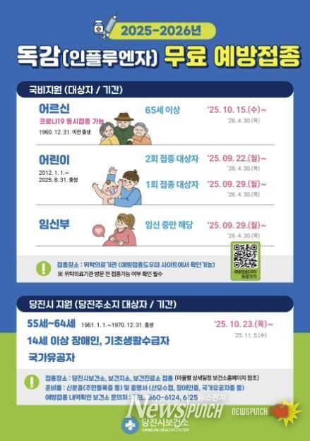 뉴스펀치 김길룡 기자 | 당진시보건소는 지난 22일 어린이(2회 접종 대상자)를 시작으로 인플루엔자(독감) 예방접종을 순차적으로 시행하고 있다고 1일 밝혔다.