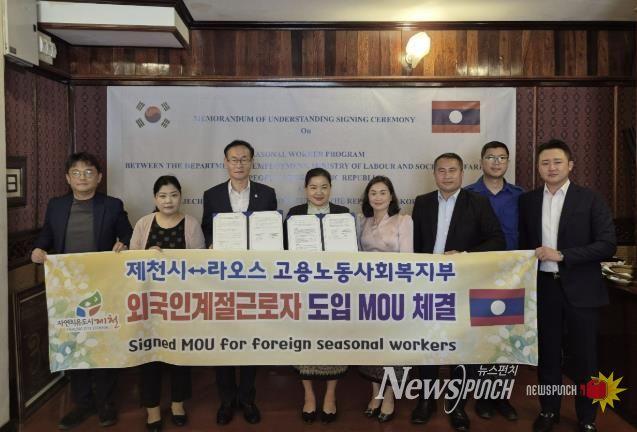 뉴스펀치 김길룡 기자 | 제천시는 지난 9월 30일 라오스 노동사회복지부와 외국인 계절근로자 도입을 위한 신규 업무협약(MOU) 을 체결했다. 이번 협약은 농번기 원활한 인력 공급을 위해 추진된 것으로, 특히 농촌 인력 공급 국가를 다변화해 불확실성을 최소화하는 데 목적이 있다.