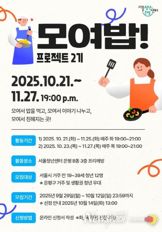 뉴스펀치 김완규 기자 | 서울 은평구는 서울청년센터 은평이 요리와 봉사를 결합한 청년 커뮤니티 프로그램 ‘모여밥’의 2기 참여 청년을 오는 12일까지 모집한다고 밝혔다.