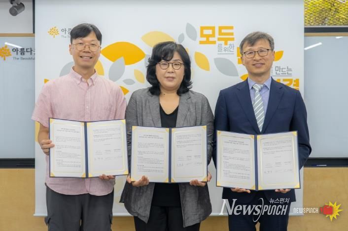 지난달 30일 서울 종로구 아름다운재단에서 열린 협약식에는 공정식 경기도 사회혁신경제국장, 김진아 아름다운재단 사무총장, 김정태 MYSC 대표가 참석했다.