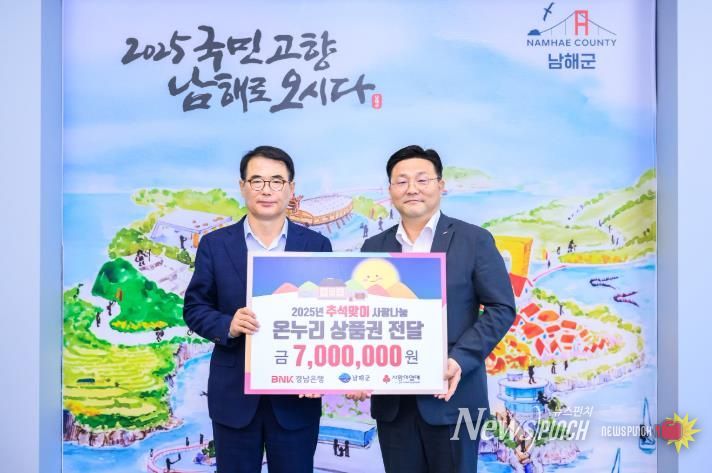 뉴스펀치 김길룡 기자 | 남해군은 지난 30일 BNK경남은행 남해지점이 추석 명절을 앞두고 700만원 상당의 온누리상품권을 기탁했다고 밝혔다.