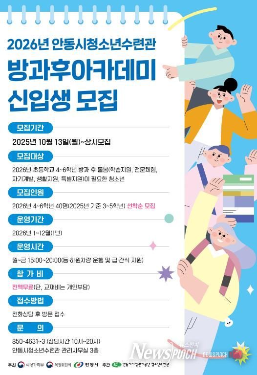 뉴스펀치 김길룡 기자 | 안동시시설관리공단이 운영하는 청소년수련관 방과후아카데미가 오는 10월 13일부터 2026년도 신입생 모집을 시작한다.