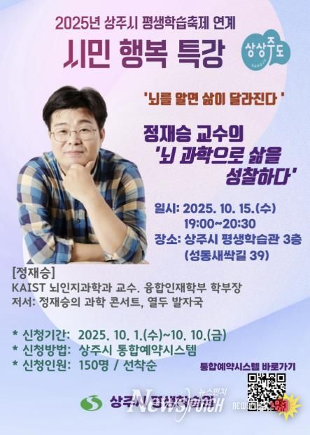 뉴스펀치 김길룡 기자 | 상주시 평생학습원은 2025. 10. 15. 오후 7시부터 8시30분까지 상주시 평생학습관 3층 강당에서 뇌과학자이자 미래학자인 정재승 KAIST 교수를 초청하여 특별 강연을 진행한다.