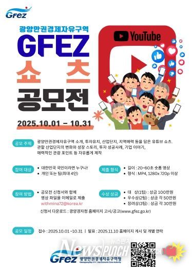 뉴스펀치 김길룡 기자 | 광양만권경제자유구역청(청장 구충곤)은 10월 1일부터 31일까지 국민 참여형 ‘2025 GFEZ 유튜브 쇼츠 공모전’을 개최한다고 밝혔다.