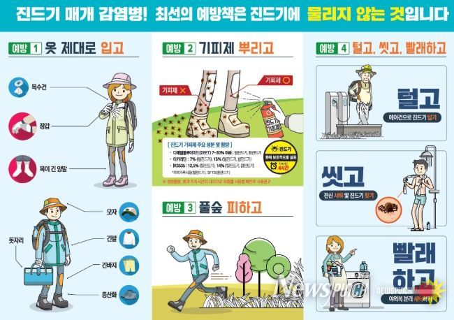 보건소 관계자는 “진드기 매개 감염병은 예방백신이 없어 야외활동 시 ▶긴소매, 긴바지, 모자 등으로 피부 노출 최소화하기 ▶4시간 간격으로 기피제 사용하기 ▶풀숲에 들어가지 않기 ▶귀가 후 즉시 목욕 및 옷 세탁 등의 예방수칙을 지키는 것이 중요하다.”고 말했다.