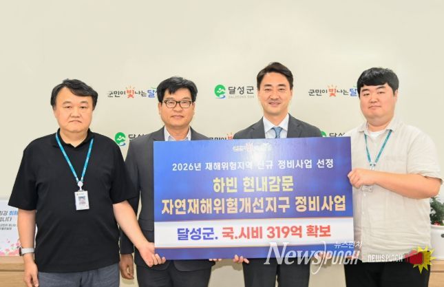 뉴스펀치 조평훈 기자 | 달성군은 행정안전부가 주관하는 ‘2026년 자연재해위험개선지구 정비사업 신규사업’에서 하빈 현내감문지구가 최종 선정돼 국·시비 319억 원을 확보했다고 밝혔다.