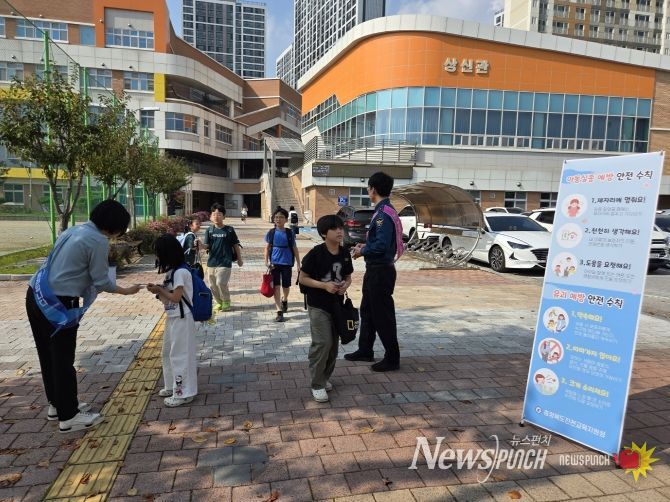 뉴스펀치 김길룡 기자 | 충청북도진천교육지원청은 10월 1일, 진천상신초 정문에서 아동 실종 및 유괴 예방을 위한 안전한 하굣길 캠페인을 실시했다.