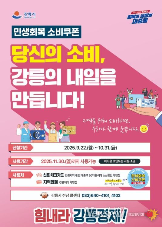 뉴스펀치 김길룡 기자 | 강릉시 민생회복 소비쿠폰 2차 신청·지급률이 85%로 순항 중인 가운데, 시는 1일부터 10일까지 민생회복 소비쿠폰 2차 소비촉진주간을 운영한다.