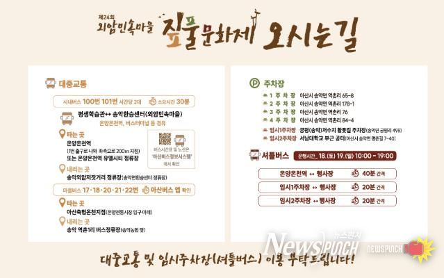 한편 시는 궁평(송악)저수지황톳길 주차장, 서남대부근 공터 등 2개소의 임시주차장을 마련하고 20분 간격으로 셔틀버스를 운행하며, 온양온천역에서 행사장까지 40분 간격으로 셔틀버스를 운행할 계획으로 방문객들의 편의 제공에 최선을 다하겠다고 전했다.