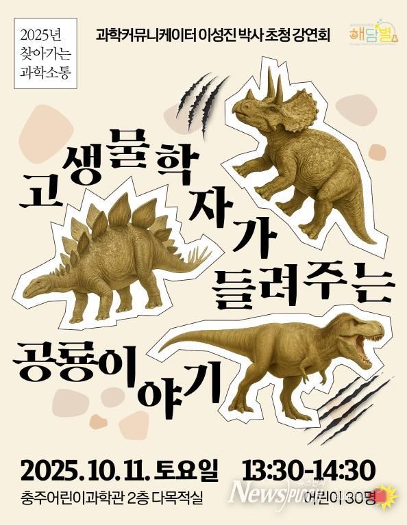 뉴스펀치 김길룡 기자 | 충주어린이과학관은 오는 10월 11일, 과학커뮤니케이터로 활동 중인 고생물학자 이성진 박사를 초청해 초등 저학년 어린이를 위한 특별 강연 ‘고생물학자가 들려주는 공룡 이야기’를 개최한다고 밝혔다.