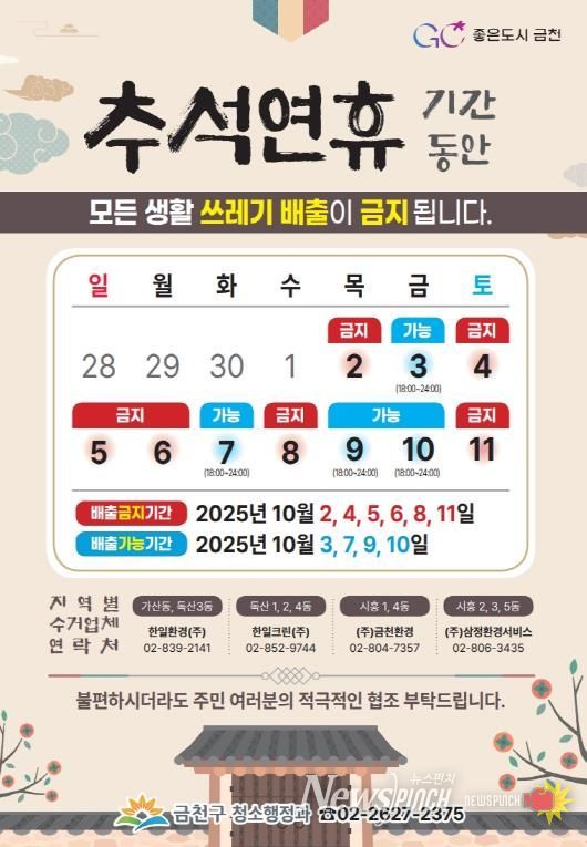 뉴스펀치 김완규 기자 | 금천구는 추석 연휴 기간 생활쓰레기(일반생활쓰레기, 음식물쓰레기, 재활용품) 수거를 일시 중단한다고 밝혔다.