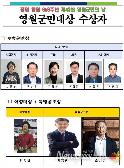 뉴스펀치 김길룡 기자 | 영월군은 정명 영월 858년 제43회 영월군민의 날을 맞이하여 다가오는 10월 31일(금), 17:00 스포츠파크 실내체육관에서 영월군민의 날 기념행사와 함께 군민대상 시상식을 개최한다.