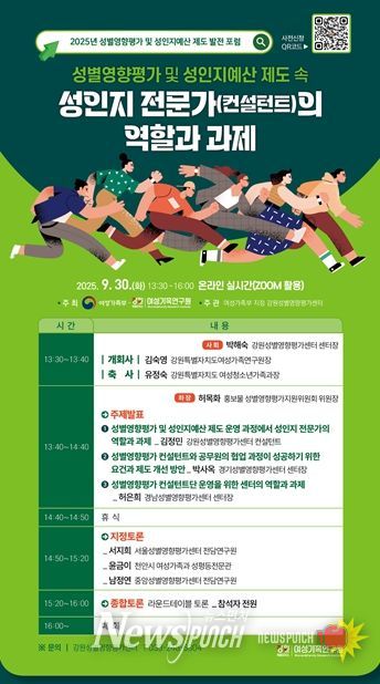 뉴스펀치 김길룡 기자 | 강원특별자치도여성가족연구원에서는 9월 30일 오후 1시 30분, 온라인 실시간(ZOOM활용)으로 ‘2025년 성별영향평가 및 성인지예산 제도 발전 포럼’을 개최했다.