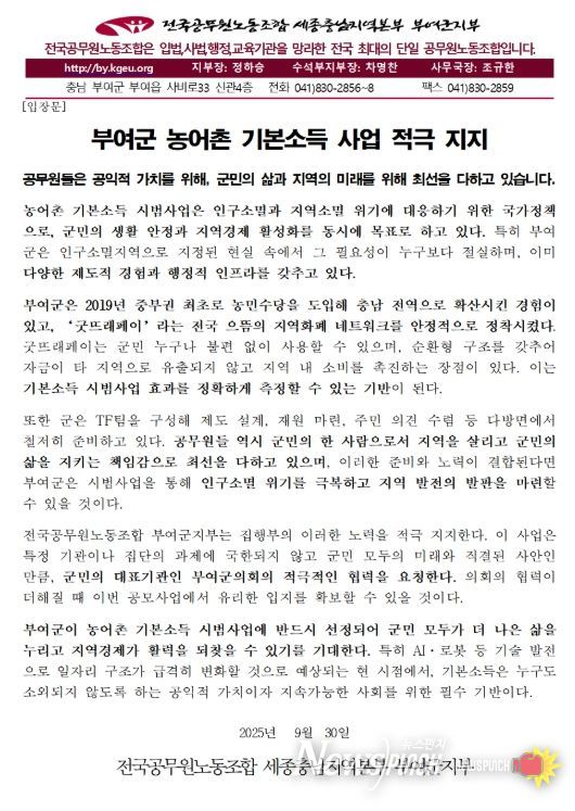 뉴스펀치 김길룡 기자 | 전국공무원노동조합 부여군지부는 지난 9월 30일 의견문을 통해, 부여군이 추진 중인 농어촌 기본소득 시범 사업을 적극적으로 지지하며, 군민과 함께 공모사업 유치에 최선을 다하겠다는 뜻을 밝혔다.