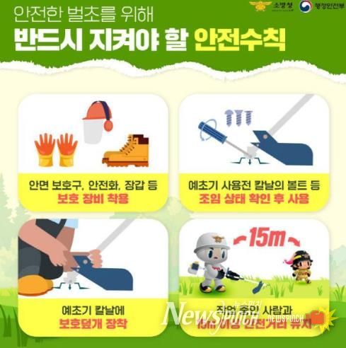 매년 이 시기에는 예초기 날에 의한 손가락·발목 절단, 튀는 돌 조각으로 인한 안면 부상, 연료 취급 부주의로 발생하는 화재 등 다양한 사고가 빈번하게 발생하고 있어 각별한 주의가 요구된다.