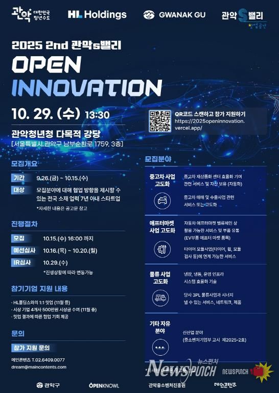 뉴스펀치 김완규 기자 | 관악구가 자동차, 물류 분야 글로벌 네트워크를 보유한 ‘HL홀딩스’와 함께 ‘2025 제2회 관악S밸리 오픈 이노베이션’에 참가할 기업을 모집한다.