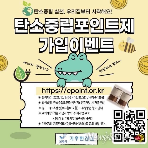 뉴스펀치 김길룡 기자 | 보령시는 탄소중립 실현과 온실가스 감축을 위한 시민 참여 확대를 목표로 탄소중립포인트제 에너지 분야 신규가입자 대상 기념품 증정 이벤트를 10월 31일까지 실시한다고 밝혔다.