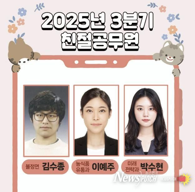 뉴스펀치 김길룡 기자 | 충북 괴산군은 2025년 3분기 친절공무원으로 김수종 주무관(불정면사무소), 이예주 주무관(농식품유통과), 박수현 주무관(미래전략과)을 선정했다고 밝혔다.