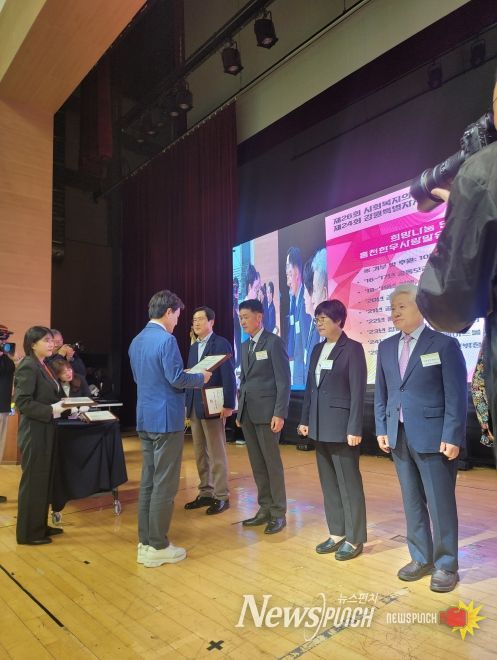뉴스펀치 김길룡 기자 | 홍천한우사랑말유통 영농조합법인은 9월 30일 춘천 호반체육관에서 개최된 “제14회 강원특별자치도 사회공헌장 수상자 시상식”에 참석하여, 희망나눔 단체부문 사회공헌장을 수상하는 영예를 안았다.