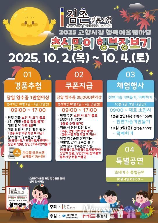 먼저, '점촌전통시장 추석맞이 행복 장보기 행사'는 10월 2일부터 4일까지 열리며 영수증 이벤트(참여 점포 구매영수증 35,000원 이상 인증 시 시장이용 쿠폰 지급), 경품행사, 체험행사로 구성되고, 특히 2일 천연가습기 만들기, 3일 떡메치기, 4일 특별공연이 있어 추석 장보기를 하면서 재미와 즐거움을 덤으로 가져갈 수 있다.