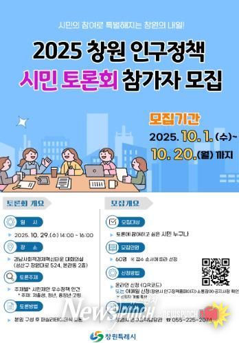 뉴스펀치 김길룡 기자 | 창원특례시는 ‘시민이 제안한 인구정책을 시민이 직접 사업화 및 고도화 시킨다’는 취지로 오는 10월 29일 ‘2025 창원 인구정책 시민토론회’를 개최하고 이를 위해 10월 1일부터 20일까지 시민 토론참가자를 모집한다고 밝혔다.
