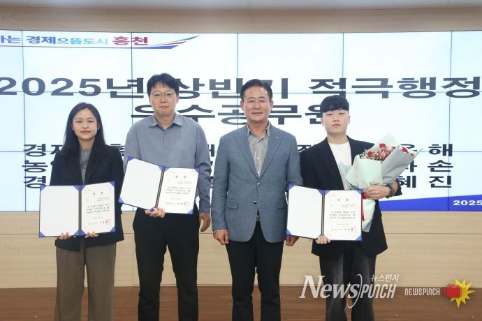 뉴스펀치 김길룡 기자 | 홍천군은 10월 1일 홍천군청 대회의실에서 2025년 상반기 적극행정 우수공무원 3명에게 상장을 수여하고 격려했다.