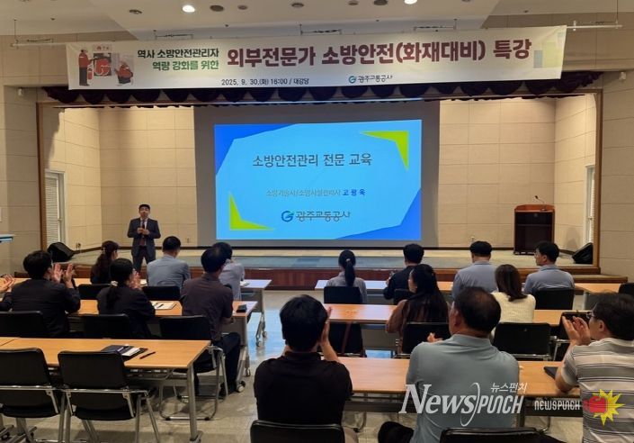 뉴스펀치 김길룡 기자 | 최근 잇따른 지하철 화재 발생으로 승객들의 안전 우려가 높아지고 있는 가운데, 광주교통공사(사장 조익문)가 소방안전관리자 역량 강화 특강을 펼치며 현장 근무자들의 위기 상황 대응 능력 제고에 나서고 있다.