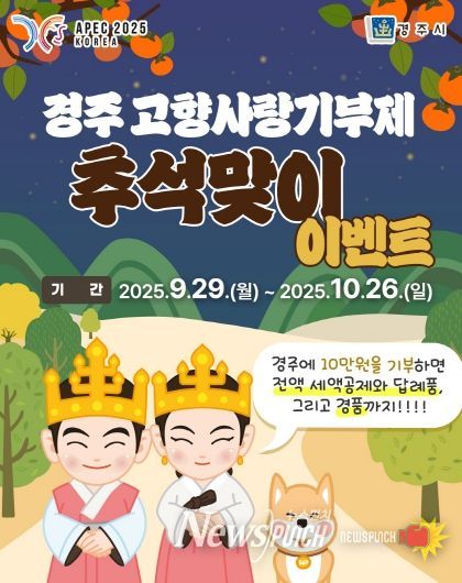 뉴스펀치 김길룡 기자 | 경주시는 추석을 맞아 고향사랑기부 활성화를 위해 지난달 29일부터 오는 10월 26일까지 ‘고향사랑기부제 추석맞이 특별이벤트’를 진행한다고 밝혔다.