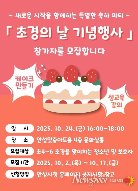 뉴스펀치 탁상훈 기자 | 안성시는 초경의 날을 맞이하여 오는 10월 24일 금요일 안성맞춤아트홀 4층 문화살롱에서 개최되는 '2025년 초경의 날 기념행사' 참여자를 오늘(2일)부터 모집한다고 밝혔다.