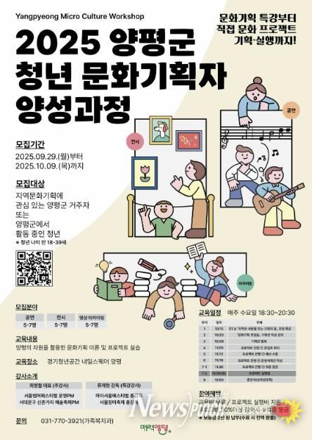 뉴스펀치 탁상훈 기자 | 양평군은 청년들의 문화·예술 기획 역량 강화를 통해 지역사회 문화 활성화와 청년 일자리 창출을 지원하고자 ‘2025년 양평군 청년 문화기획자 양성과정’을 10월부터 12월까지 운영한다고 밝혔다.
